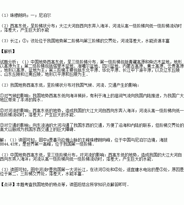 (1)图中A是世界最高峰 峰,位于我国第 级阶梯,它位于我国和 (国家)交界处.