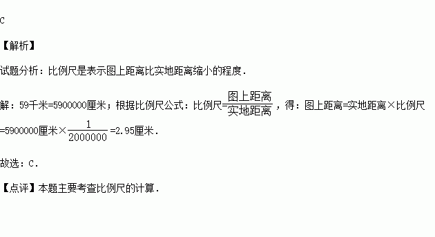 如果两地的实际距离是59千米,那么在比例尺为1:2000000的地图上,两地间的直线距离应是( )