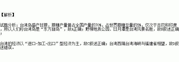 A.享有“东方甜岛”的美誉 B.野柳地质公园、日月潭是台湾风景名胜
