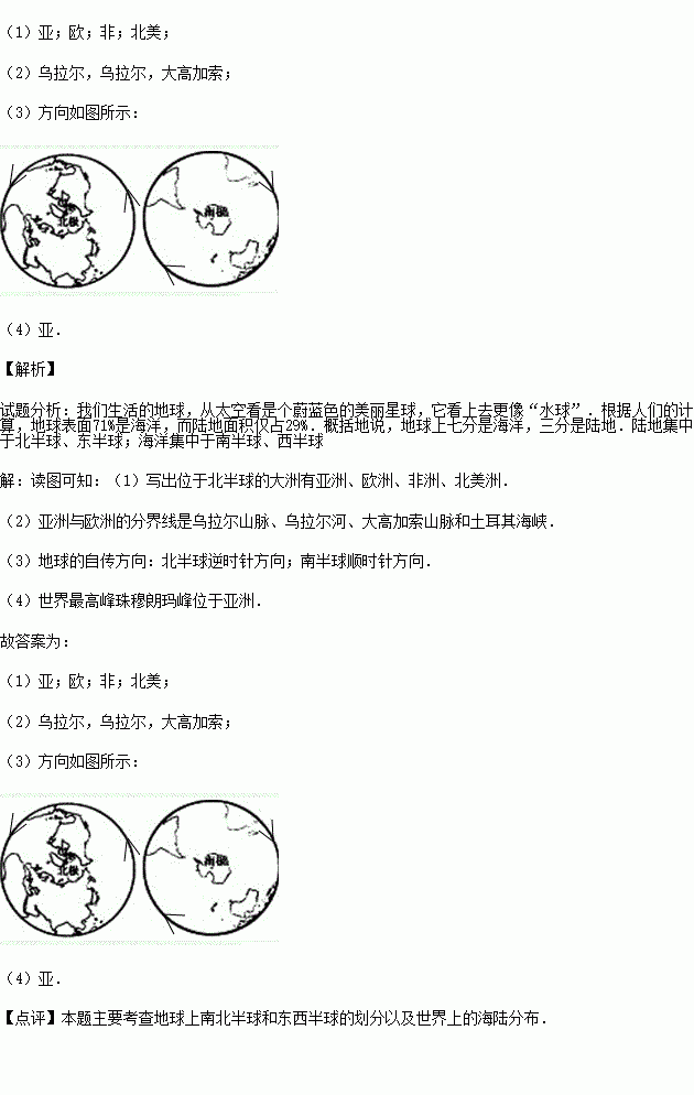 (1)写出位于北半球的各大洲名称 洲、 洲、 洲、 洲.