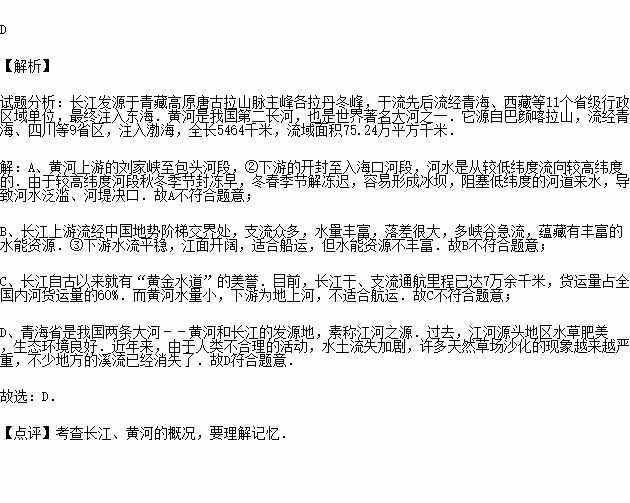 长江、黄河流域是中华民族文明的摇篮.读图,关于两河的描述正确的是( )