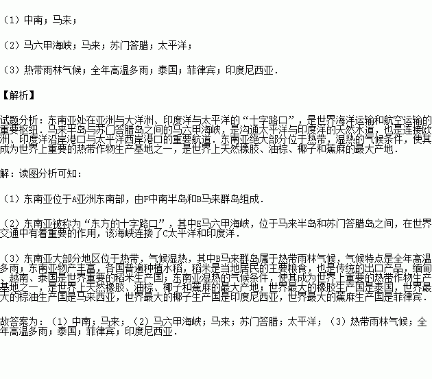(2)东南亚被称为“东方的十字路口”,其中海峡E (填写名称),位于 半岛和 岛之间,在世界交通中有着重要的作用,该海峡连接了大洋C 和印度洋.