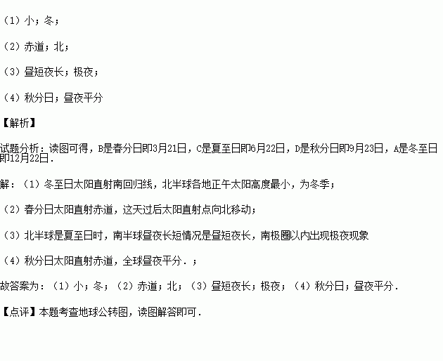 (1)地球处在A位置时,北半球各地正午太阳高度最 ,为 季.