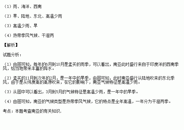 (1)读图可知孟买6月到10月降水量多,是 季,参考上图得知南亚此时盛行来自 (海洋/陆地)的 (方向)季风,它温暖湿润,给南亚带来大量降水。