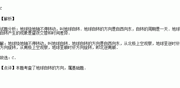 D.从南极上空观察,地球呈顺时针方向旋转