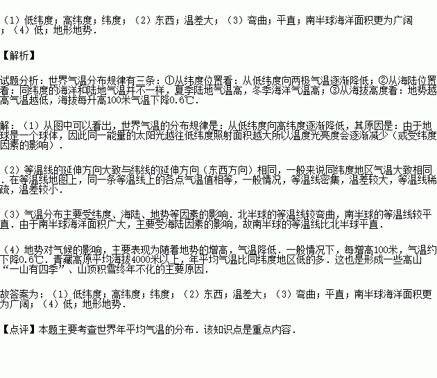 (1)从图中可以看出,世界气温的分布规律是:从 向 逐渐降低,这说明影响气温分布的主要因素是 .