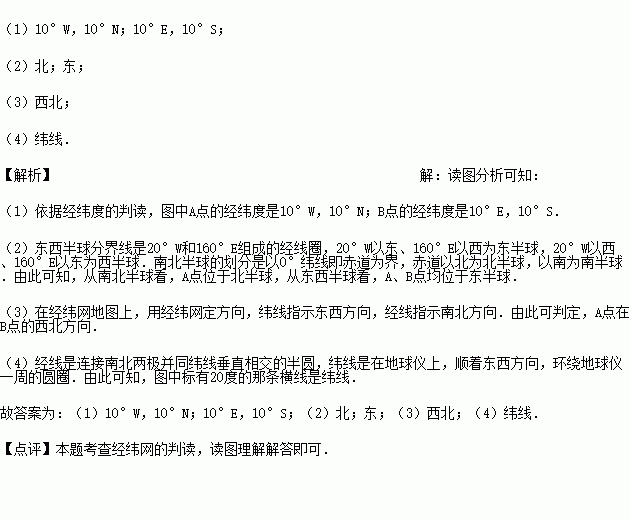 (2)判断A、B两点的半球位置:从南北半球看,A点位于_ 半球,从东西半球看,A、B点均位于 半球.