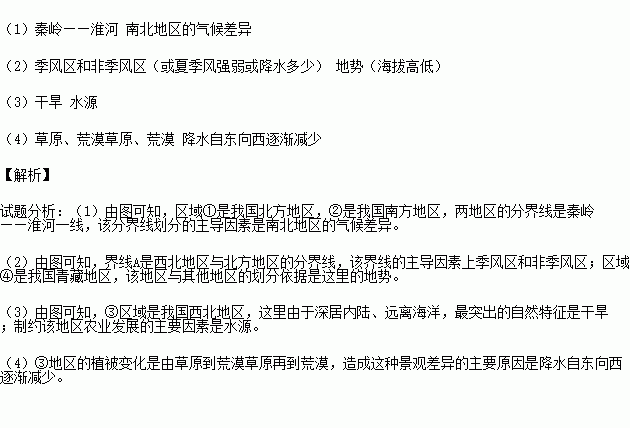(4)③地区的植被变化,由东向西依次是_________、_________、_________;造成这种景观差异的主要原因是__________________________________________________。