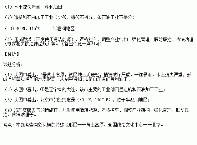 (1)图中A高原主要的生态环境问题是______________严重,形成“沟壑纵横”的地表形态。矿产地B是 。