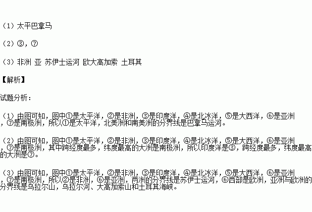 (3)②是 洲,⑥是洲,两洲的分界线是 。⑥西部紧连的大洲是 洲二者的分界以乌拉尔山、乌拉尔河、山脉和海峡为界。