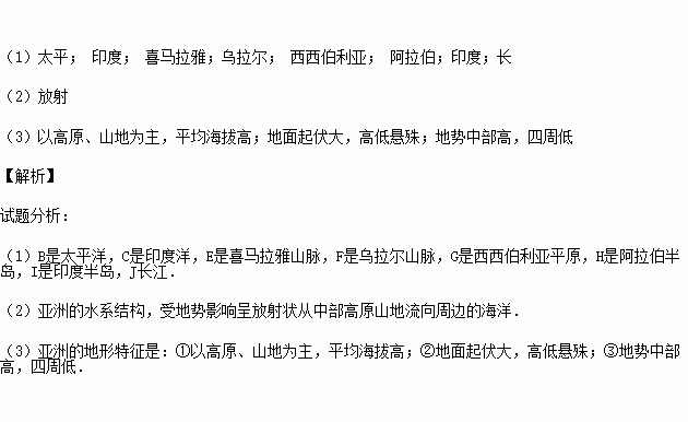 (2)亚洲的水系结构呈 状从中部高原山地流向周边的海洋。