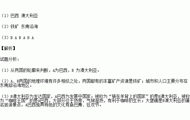 £¨2£©A¡¢BÁ½¹úµÄµØÀí»·¾³ÓÐÐí¶àÏàËÆÖ®´¦£¬Èç £¨¿ó²ú×ÊÔ´£©¶¼·Ç³£·á¸»£»È˿ڡ¢³ÇÊж¼Ö÷Òª·Ö²¼ÔÚ µØÇø¡£