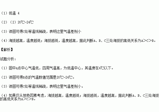 (3)C处的等温线 (稀疏、密集),表明这里气温差别 (大、小)。