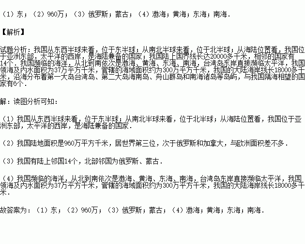 (2)我国陆地领土面积为 平方千米.