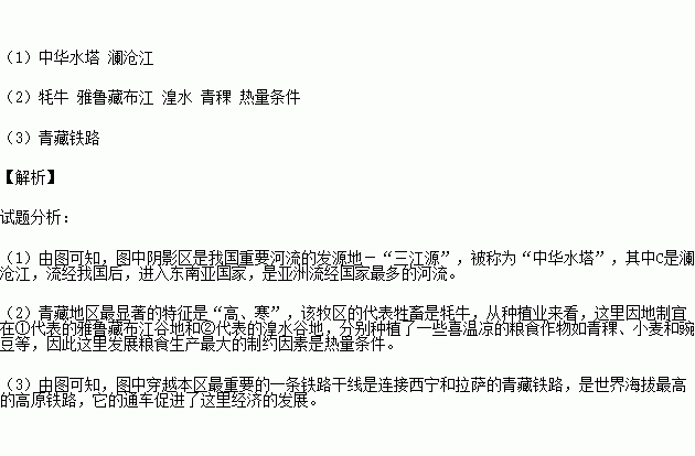 (1)图中阴影区是我国重要河流的发源地——“三江源”,被称为“________”,它是我国最大的生态保护区,其中河流C是________。