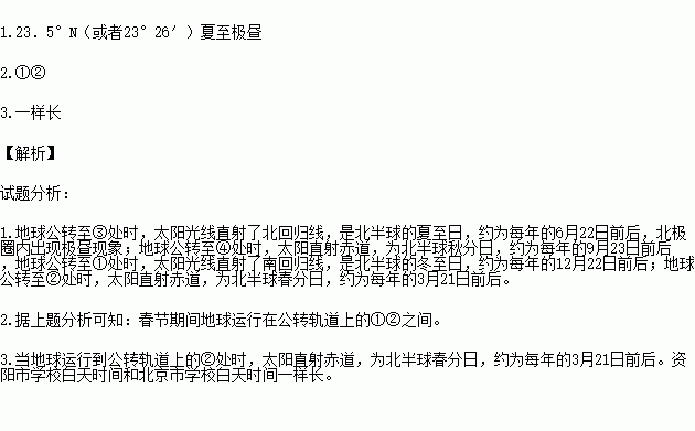 1.当地球运行到公转轨道上的③处时,太阳光直射纬线的纬度是