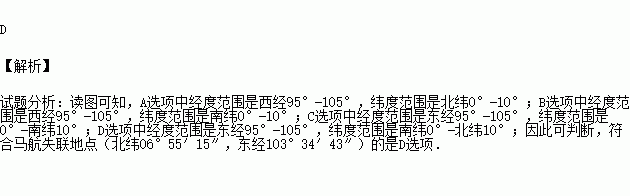今年3月,马航MH370从吉隆坡至北京航班途中失去联系,假如失踪地点为北纬6°,东经103°,那下图表示中最接近该地点的是( )