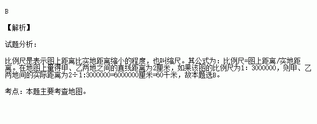 在地图上量得甲、乙两地之间的直线距离为2厘米,如果该图的比例尺为1﹕3000000,