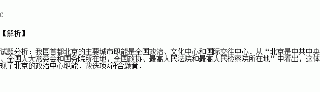 “北京是中共中央、全国人大常委会和国务院所在地,全国政协、最高人民法院、最高人民检察院也在北京.中央和国务院各部委、各人民团体的中央机构都在北京办公,与我国建立了外交关系的各个国家,都在北京设立了驻华使馆机构.”这段话充分说明北京城市职能之一是( )
