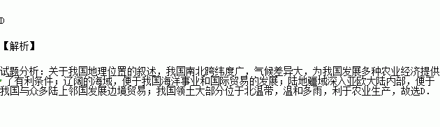D.我国领土全部位于北温带,温和多雨,利于农业生产