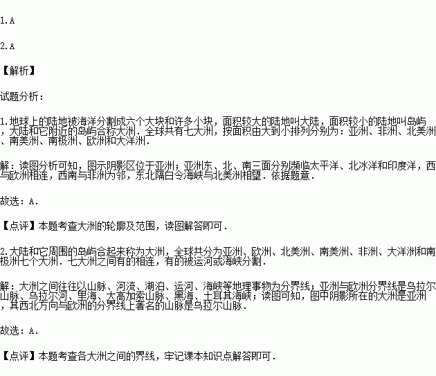 2.图中阴影西北方向的大洲分界线上著名的山脉是( )