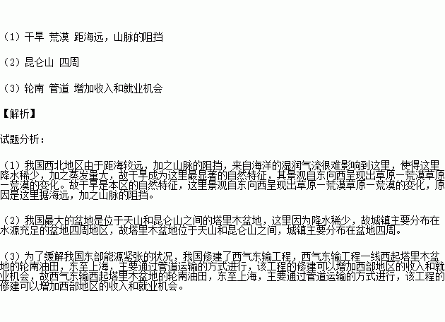 (3)西气东输一线工程西起塔里木盆地的 油气田,东至上海,该工程采用的运输方式是 ,西气东输工程对西部地区的有利影响有 等。(写一条即可)
