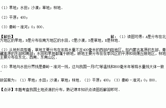 (2)我国的耕地主要分布在季风区的 和低缓丘陵地区,草地主要分布在年降水量不足 毫米的西部内陆地区.