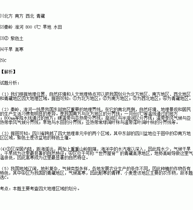 (3)四川省跨越了四大地理单元中的两个区域,东部的四川盆地位于图中的 (填编号)区域,该盆地的特色土壤是 土。