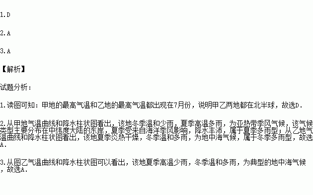 读“甲、乙两地气温曲线和降水月分配图”,回答下列各题。
