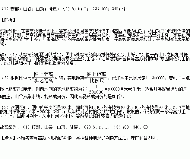 (3)F点的海拔为 米,C、E两地的相对高度是 米,从甲村到乙村①、②两条线路比较省力的是 .
