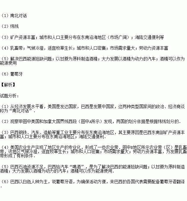 (1)从经济发展水平看,美国是发达国家,巴西是发展中国家,这两种类型国家间的政治、经济商谈称为“ ”。