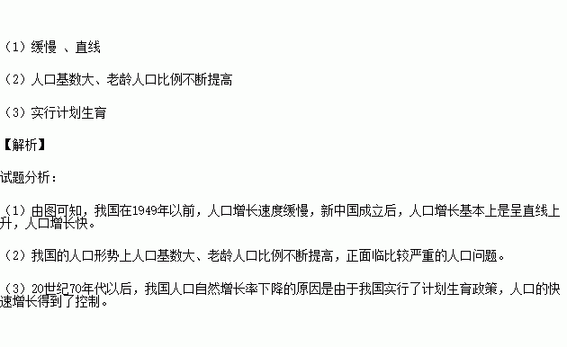 (1)根据曲线图可以看出1949年以前,我国人口增长速度比较 ,新中国成立后,人口增长基本上呈 线上升。