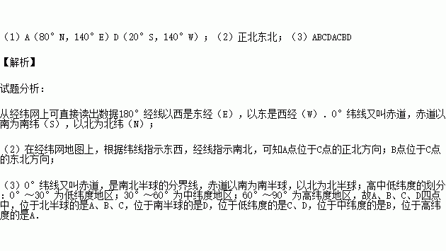(3)A、B、C、D四点中,位于北半球的是,位于南半球的是,位于东半球的是,位于西半球的是。(填字母)