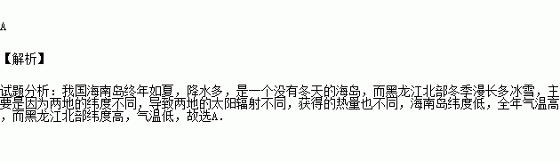 我国海南岛终年如夏,降水多,是一个没有冬天的海岛;而黑龙江省北部冬季漫长多冰雪,这种不同主要取决于: