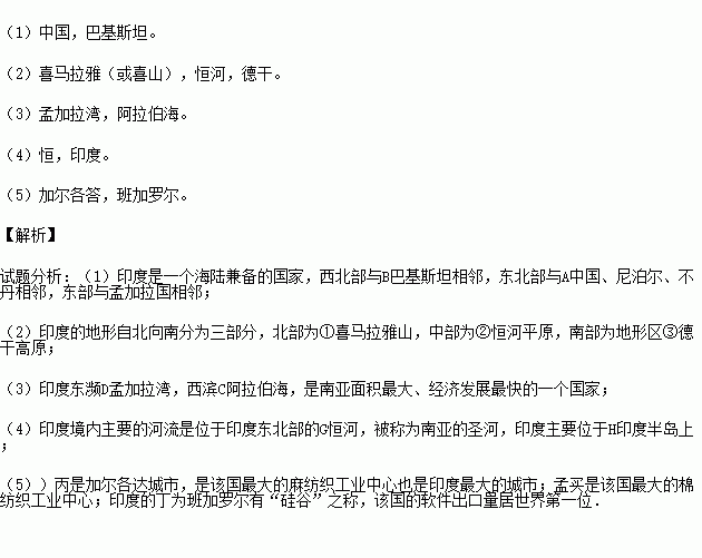 (5)主要城市: 最大的麻纺织工业中心:丙是 , 也是印度最大的城市;丁是印度的“硅谷”: 。(填城市名)