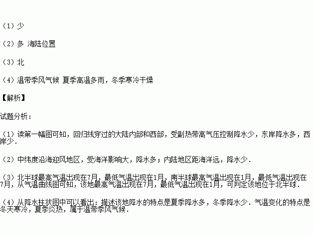 (1)读第一幅图,在南北回归线附近,大陆西岸降水__________ (多或少)。