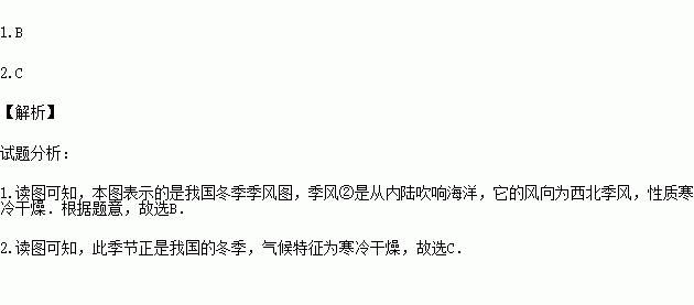 1.右图中,季风②的风向为