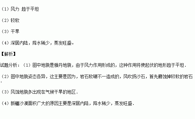 (2)图中地貌姿态各异,这主要是因为,岩石软硬不一造成的,风吹扬沙石,首先磨蚀掉_______的岩石。