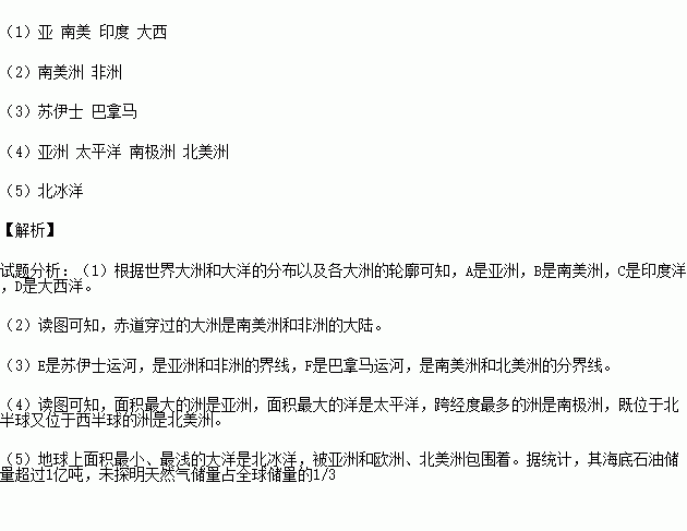 (5)地球上面积最小、最浅的大洋是 ,据统计,其海底石油储量超过1亿吨,未探明天然气储量占全球储量的1/3