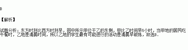 甲、乙两地时差6小时,当甲地居民吃午餐时,乙地的学生最有可能进行的活动是( )
