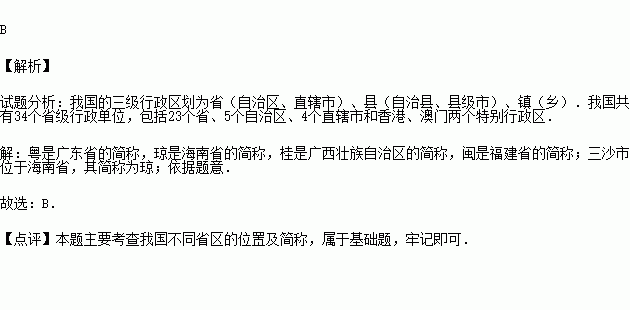 2012年,我国宣布批准撤销海南省西沙群岛、南沙群岛、中沙群岛办事处,设立地级市三沙市.三沙市所在省级行政区的简称是( )