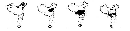 下面的四幅图是我国的冬小麦、油菜、水稻和甜菜的集中产区分布图,图序与下列排序一致的是( )
