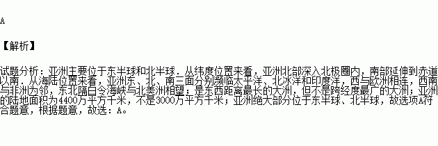 C.亚洲的面积约是3000万平方千米 D.亚洲绝大部分位于西半球、北半球