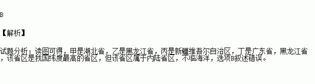 B.乙省区是我国纬度最高的省区,东临太平洋