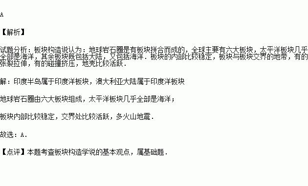 A.印度半岛属于亚欧板块,澳大利亚大陆属于印度洋板块