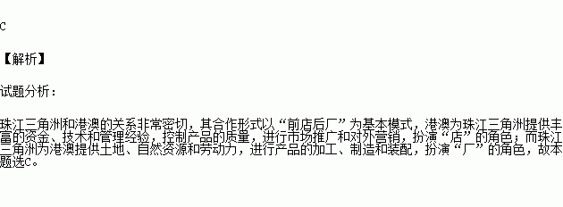 为发挥区域优势,珠江三角洲和港澳地区充分合作,形成了“前店后厂”合作模式,在该合作中,港澳地区主要扮演的角色是( )