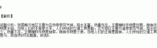 C.传统运输:南船北马 D.糖料作物:南甘北甜