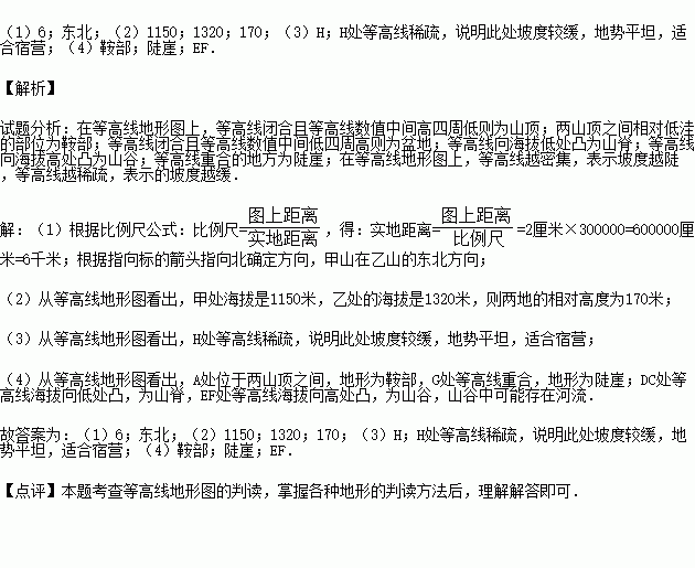 (4)A处地形为 ,G处地形为 图中DC线和EF线地形中, 处可能存在河流.