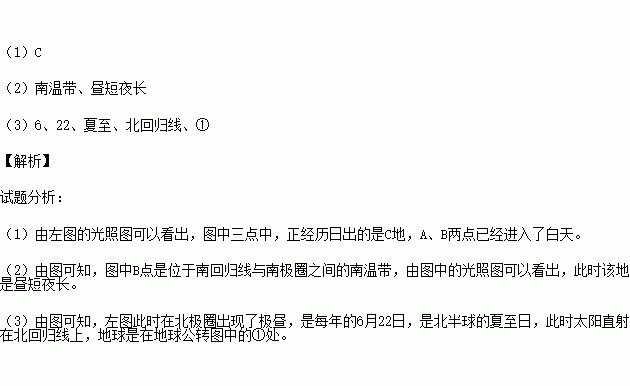 (1)左图中A、B、C三地中,正在经历日出的是 ________地。