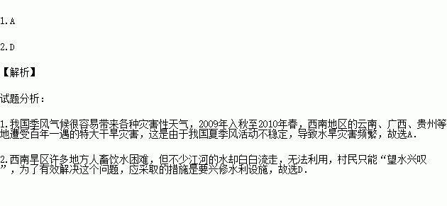 ÎÒ¹ú¼¾·çÆøºòºÜÈÝÒ×´øÀ´¸÷ÖÖÔÖº¦ÐÔÌìÆø¡£2009ÄêÈëÇïÖÁ2010Äê´º£¬Î÷ÄϵØÇøµÄÔÆÄÏ¡¢¹ãÎ÷¡¢¹óÖݵȵØÔâÊܰÙÄêÒ»ÓöµÄÌØ´ó¸ÉºµÔÖº¦¡£¾Ý´Ë»Ø´ðÏÂÁÐÎÊÌâ¡£